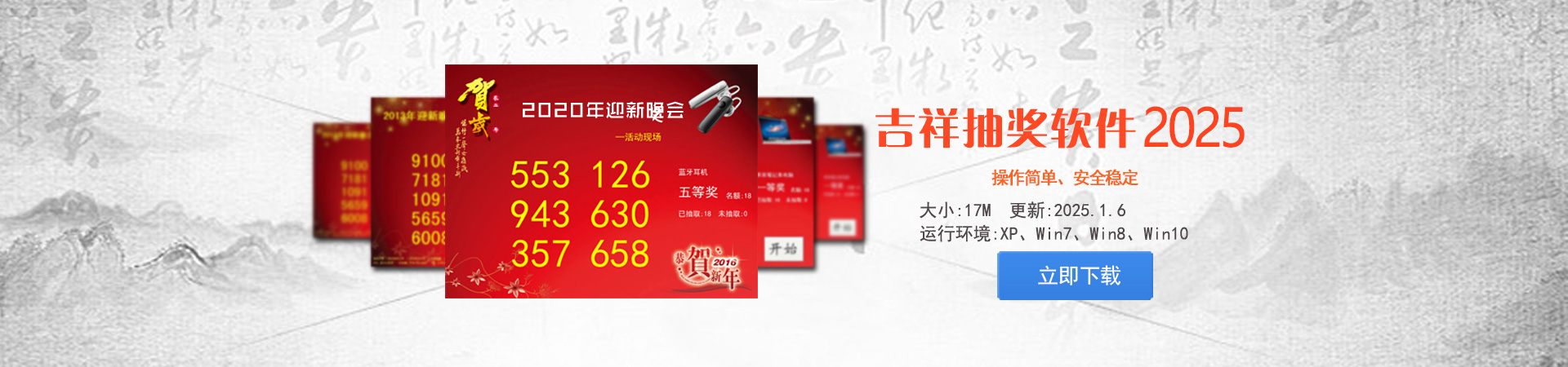 吉祥抽奖软件:是一款功能全面、界面简洁、操作简单、容易上手的抽奖软件,适用于年会抽奖、晚会抽奖、活动抽奖、婚礼、庆典、生日抽奖等各类抽奖活动
